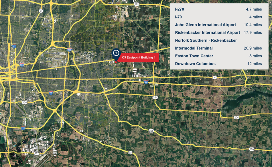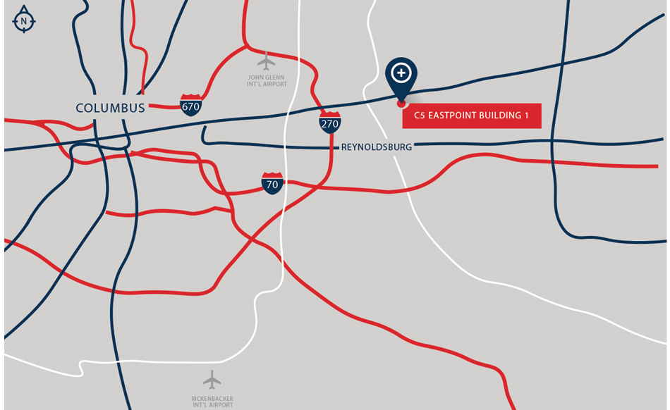 C5 Eastpoint Building 3 is located in Reynoldsburg, Ohio with direct and convenient access to all of Columbus via I-270 to the west and I-70 to the south. With close proximity to Columbus’s John Glenn International Airport along with the Rickenbacker International Airport and Norfolk Southern - Rickenbacker Intermodal Terminal, the property is ideally situated for both domestic and international business trades requiring local, regional and national distribution. A robust and skilled population base offers a solid workforce infrastructure. The building has state-of-the-art amenities and offers a 15-year, 75% tax abatement.
