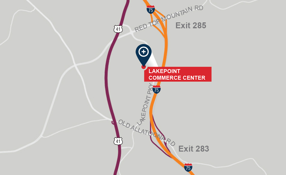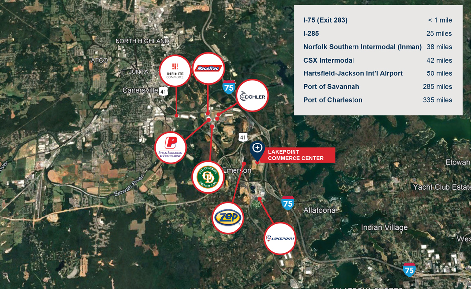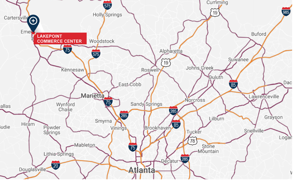 LakePoint Commerce Center is strategically located on LakePoint Parkway in Emerson, Georgia. The site is located less than one mile from two different I-75 N interchanges, a Love’s Truck Stop, and a variety of restaurants. Access to Hartsfield-Jackson International Airport and four major interstates (I-20, I-75, I-85 and I-285) make it one of Atlanta’s most desirable business/distribution locations.<br />
